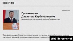 Сетевое сообщество «Диссернет» обвинило в плагиате председателя Хатлонской области Давлатшо Гулахмадзода.